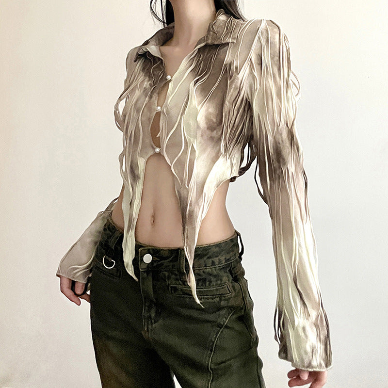 Solid Color Slim Fit Midriff-baring Fashion Polo Collar Long Sleeve Cardigan T-shirt